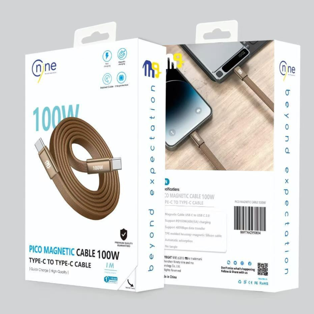 يوفر كابل ناين بيكو المغناطيسي بقدرة 100 وات تجربة شحن فائقة السرعة مع تصميم عملي يعتمد على تقنية المغناطيس لسهولة الاستخدام وتنظيم الكابل بدون تشابك.