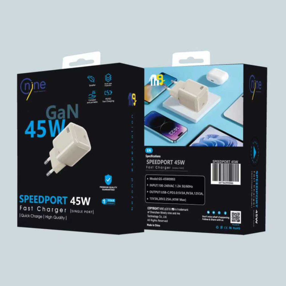 يوفر شاحن ناين سبيد بورت بقدرة 45 وات أداءً سريعًا وفعالًا لشحن مختلف الأجهزة، بفضل تقنية GaN الحديثة التي تتيح كفاءة أعلى مع تقليل الحجم والحرارة.