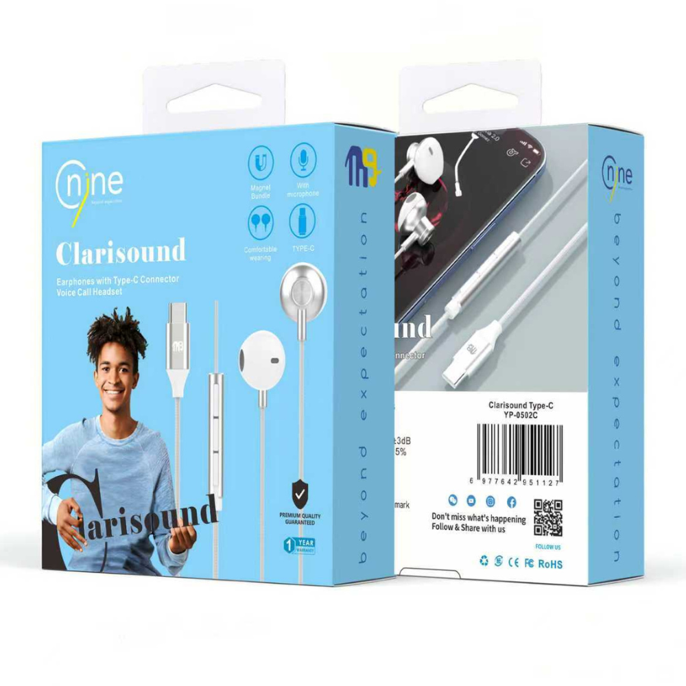 Enjoy clear and balanced sound with Nine Clarisound Type-C Earphones, designed for high-quality audio and reliable call performance.