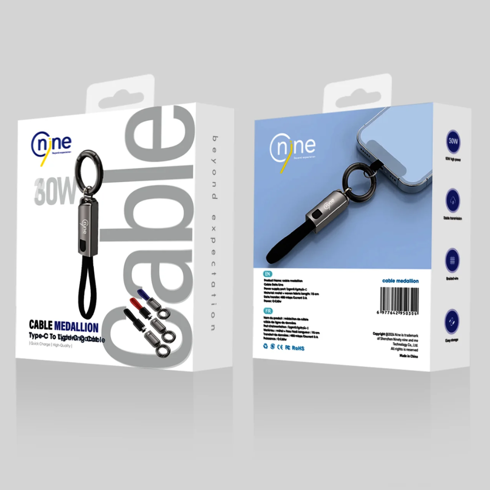 A compact and portable charging & data cable from NINE designed in a keychain style, combining convenience and performance. Perfect for everyday use, travel, and on-the-go situations.